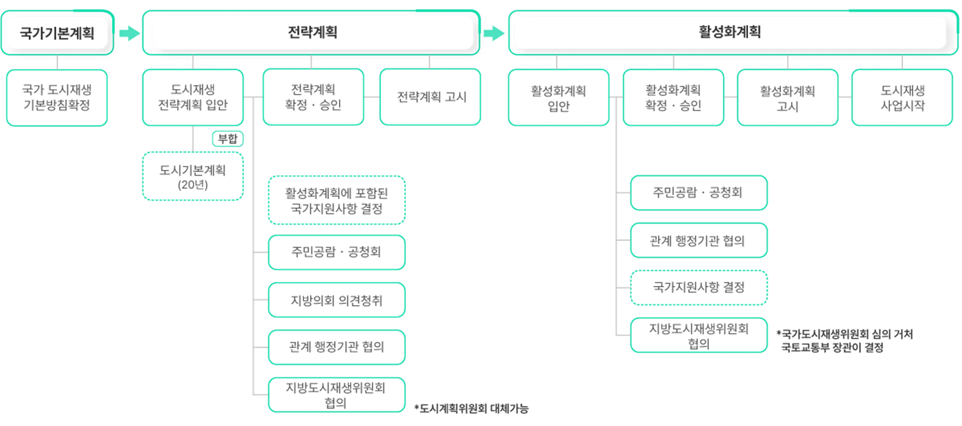 ▶ 도시재생사업 추진절차는 크게 ① 국가차원의 '국가 기본계획' → ② 대상 도시 단위의 '도시재생 전략계획' → ③ 도시재생 전략계획을 실행하기 위한 '활성화 계획' 으로 구분된다.