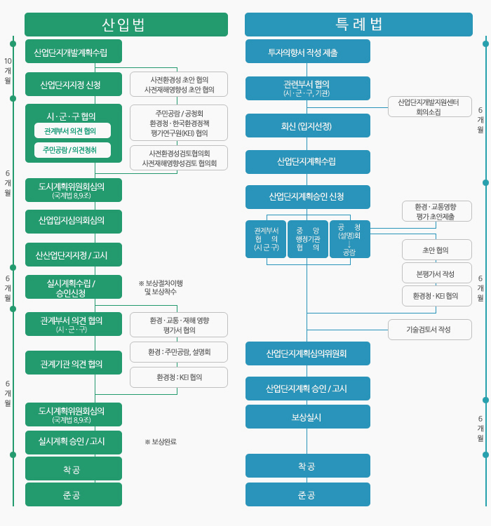- 두 법률 간 가장 큰 차이점은 사업기간에 있다. 산업단지 개발계획계획 수립 이후 실시계획인가를 별도로 받아야 하는 산입법과 달리 산단특례법은 산단 개발계획과 실시계획인가를 동시에 진행할 수 있다.